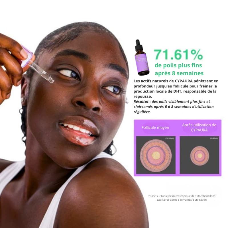 Grâce à l’extrait botanique de Cyperus Rotundus et aux autres ingrédients naturels de sa formule, CYPAURA cible directement la structure du poil là où il se forme, sans influencer le fonctionnement hormonal global.